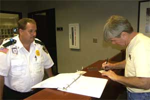 | Behind us is a statue of Clyde Cessna as a boy. At the age of 32 he designed and built his own airplane, and then taught himself to fly! | Steve checks in with Dale, who is chief of security. Security is tight there. We had to wear visitor passes and be escorted everywhere we went. The buildings have cameras mounted outside and security constantly patrols the premises. | |